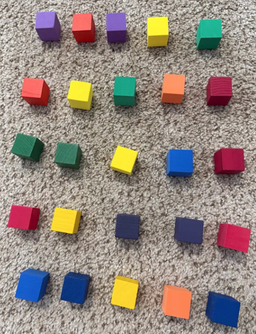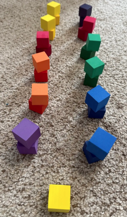 When children count, they need to match one number word to one object in the set, without skipping objects or double-counting. For example, if a child is counting five blocks, they point to each block in turn and say: