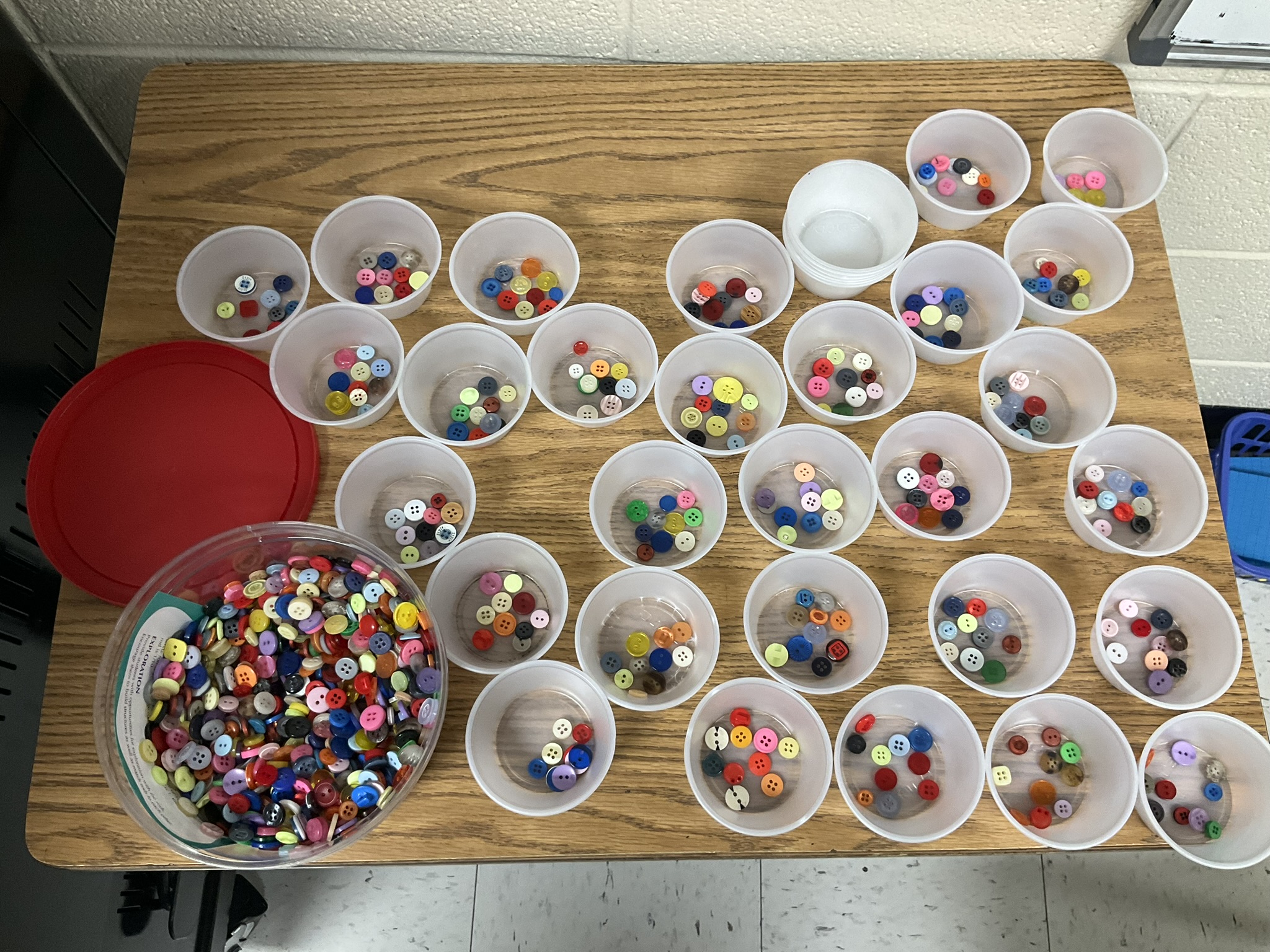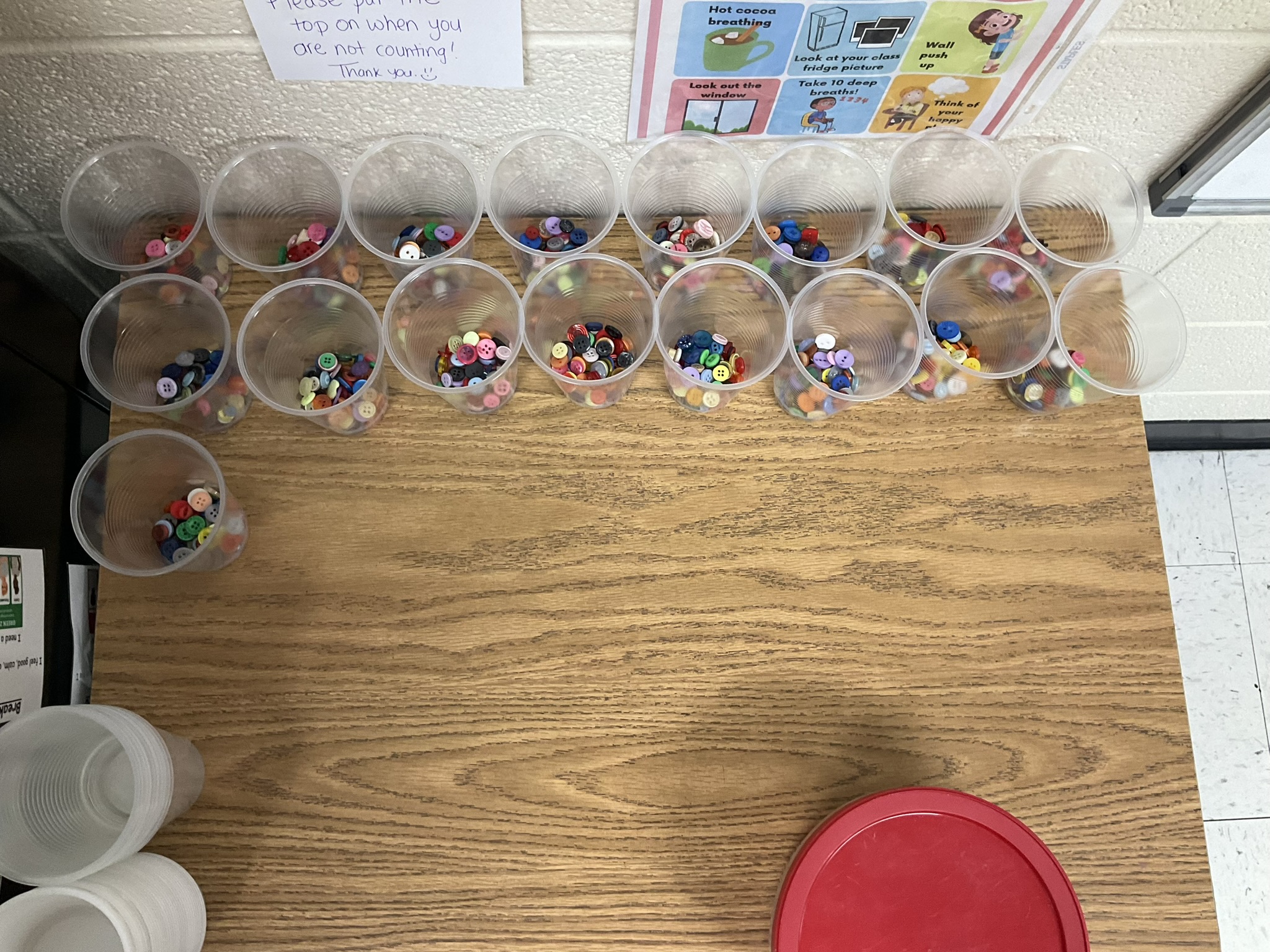 I told my students that our job was to find out how many buttons, but that we couldn’t spend class time counting them together. I wanted us to set up an area where someone could count when they had a few minutes, and then another person would be able to come and pick up where they left off. I left it up to the class to come up with a system. They asked if they could use some portion cups that we had used for other purposes in class, and decided that they would put ten buttons in each cup. We set up a desk in the back of the room with buttons and cups.
