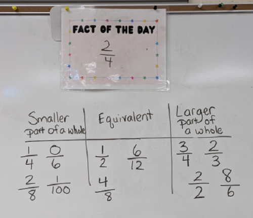 After our first fraction quick check, we reflected on our data and what students had learned about fractions so far. Students came together and shared what went well and what could change to improve their learning. One of my students had a suggestion that the fact of the day was not helping them learn about fractions and should become a fraction of the day. That student wasn't quite sure what that might look like, so I wrote it down and asked everyone to start thinking about it. After several informal conversations between students, some of them including me, they had a plan. We would consider a fraction each day and then name other fractions that would be a larger, smaller, or equivalent part of the whole. I was amazed by their idea. So Fact of the Day turned into a Fraction of the Day.