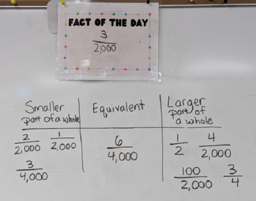 More and more fractions beyond the range of the third grade standards started to make their way naturally into our learning. For example, to emphasize the idea that the more pieces in a whole, the smaller the pieces become, we talked about things like sharing a cake with every classroom teacher in the school so each person would receive (1/27.) Fractions like 1/27, 1/100, and 3/1,000 started to appear in students' responses to the Fact of the Day as they reasoned about the size of the pieces. Then, one day, I saw the Fraction of the Day: 3/2,000. My first thought was to ask the student to change the fraction - I thought it might frustrate many of my students, and although we had explored and found patterns with equivalent fractions, we were using models and had never tried finding something equivalent to a fraction like that! Thankfully I chose to trust that the reasoning students' had built would support them. They did not disappoint.