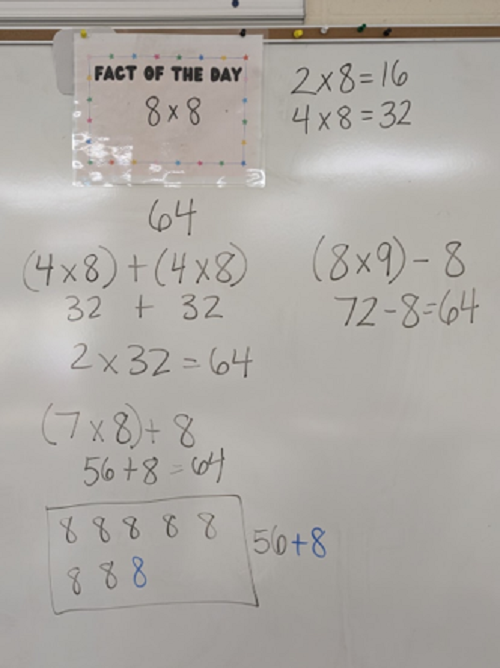It started with a simple daily routine. As we were learning multiplication, I presented students with a fact of the day. I started with foundational facts, and then carefully chose a sequence of daily facts designed to highlight strategies and relationships and build new strategies. We would keep a list of the recent facts and share and discuss how one fact might connect to another. Essentially, we were doing a problem string (to learn more, see our Reel Classroom video problem strings) over multiple days.